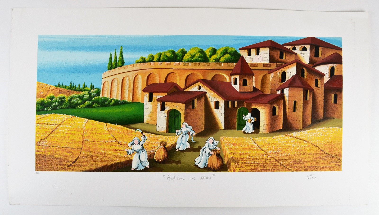 ULISSE (n. 1957) Untitled (Mietitura ad Osimo). Silkscreen. Cm 90,00 x 50,00. P.a. Edition, title and signature lower in pencil.
