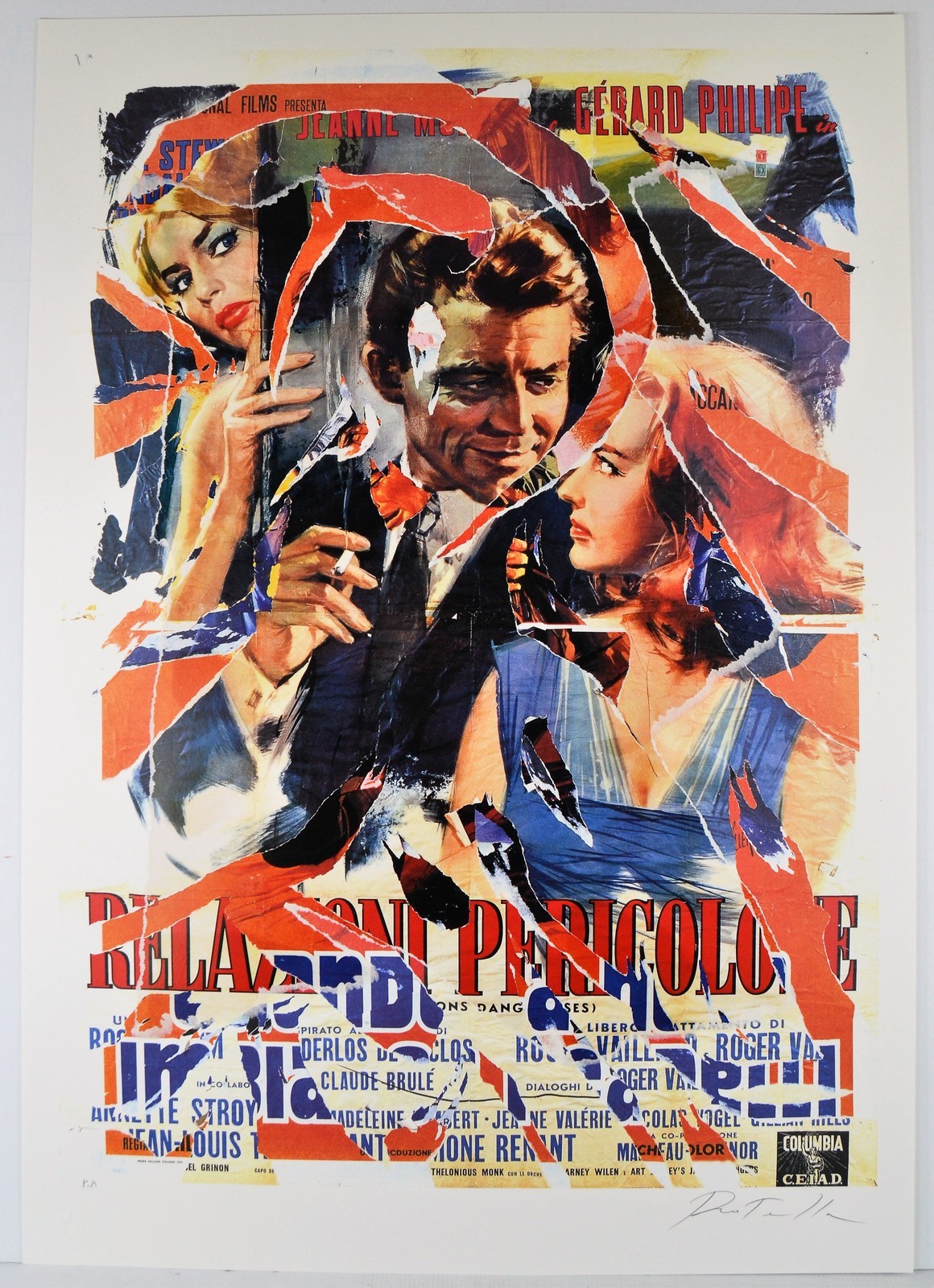 ROTELLA MIMMO (1918 - 2006) Relazioni pericolose. Litodecollage. Cm 100,00 x 70,00. P.A. Tiratura e firma in basso a matita. Timbro a secco Fondazione Mimmo Rotella, Milano in basso a sinistra. Pubblicazione: Mimmo Rotella - multiples décollages a cura di Elena Pontiggia, Silvana Editoriale, 2005, p. 36.