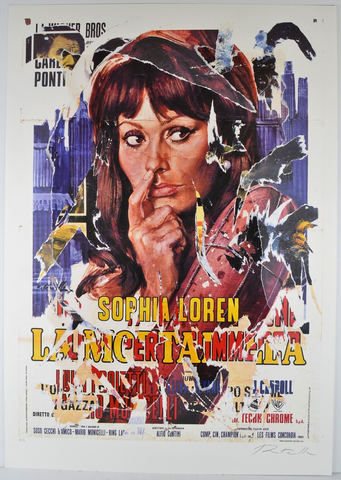 ROTELLA MIMMO (1918 - 2006) Mortadella. Litho-decollage. Cm 100,00 x 70,00. P.a. Edition and signature lower in pencil. Mimmo Rotella Foundation , Milan stamp lower left. Publication: Mimmo Rotella- multiples décollages by Elena Pontiggia, Silavana editions, 2005, p.88.