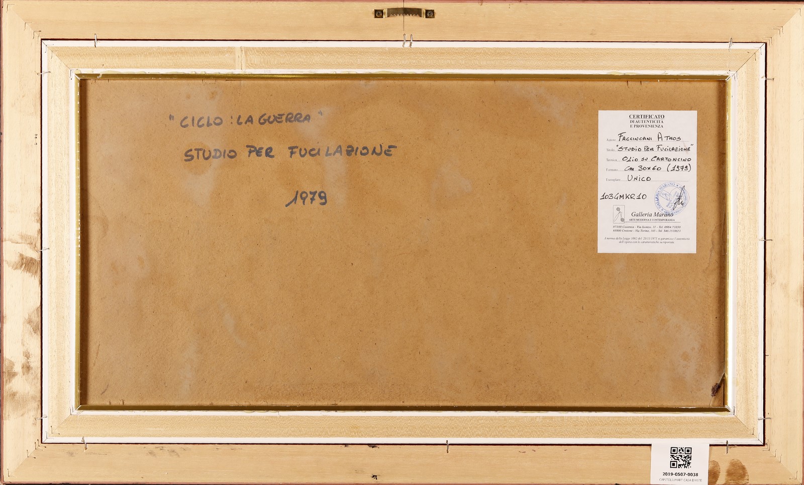 FACCINCANI ATHOS (n. 1951) Studio per fucilazione. 1979. Olio su cartoncino. Cm 60,00 x 30,00. Firma in basso a destra. Al retro titolo, anno e cartiglio descrittivo con timbro Galleria Marano. Cornice presente