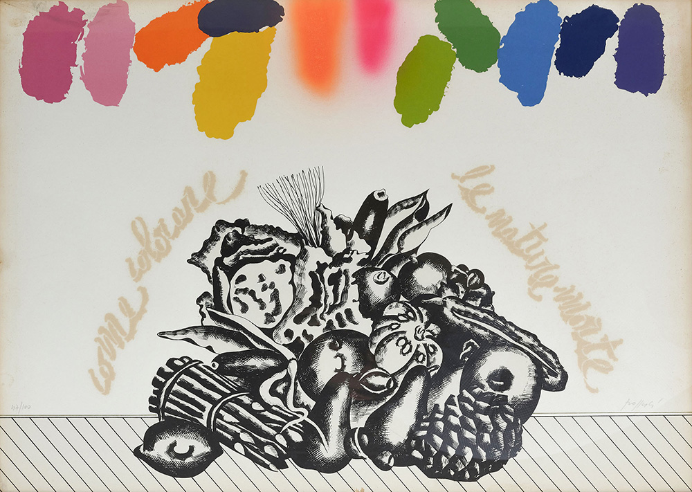 Concetto Pozzati 1935 - 2017 Come Colorare le Nature Morte Litografia H49.5 x L69 cm (19.49 x 27.17 in. ) Firma in basso a destra Tiratura in basso a sinistra Es. 47/100 Provenienza Collezione privata, Milano L' opera è incorniciata.