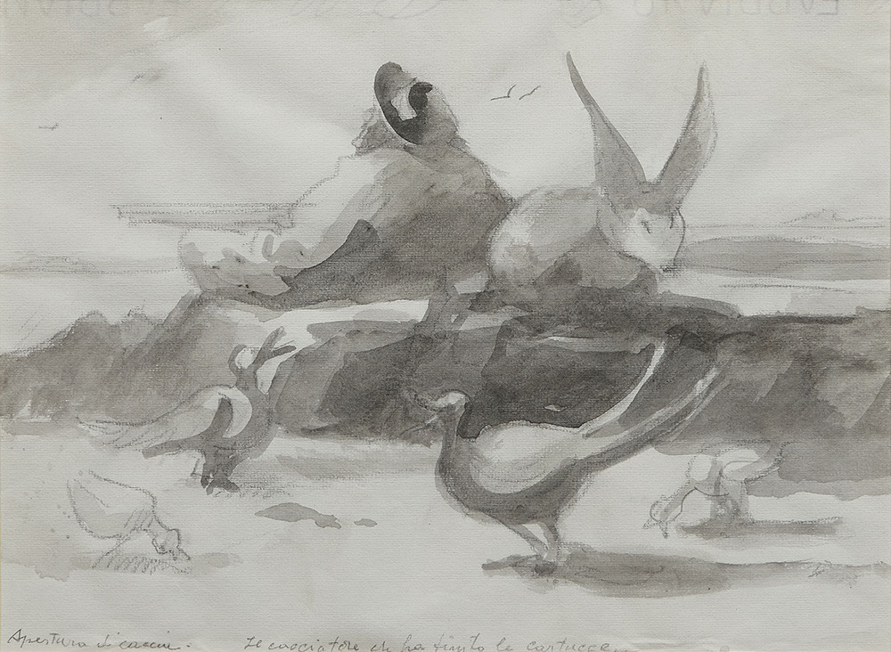 Amerigo Bartoli 1890 - 1971 Apertura di caccia Tecnica mista su carta H22.5 x L30 cm (8.86 x 11.81 in. ) Titolo in basso Provenienza Collezione privata, Milano L' opera è incorniciata.