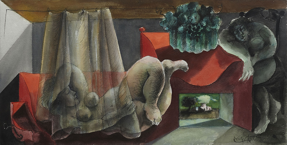 Ercole Pignatelli 1935 Figure con paesaggio Tecnica mista su carta H31 x L60 cm (12.20 x 23.62 in. ) Firma in basso a destra Provenienza Collezione privata, Milano L'opera è incorniciata.