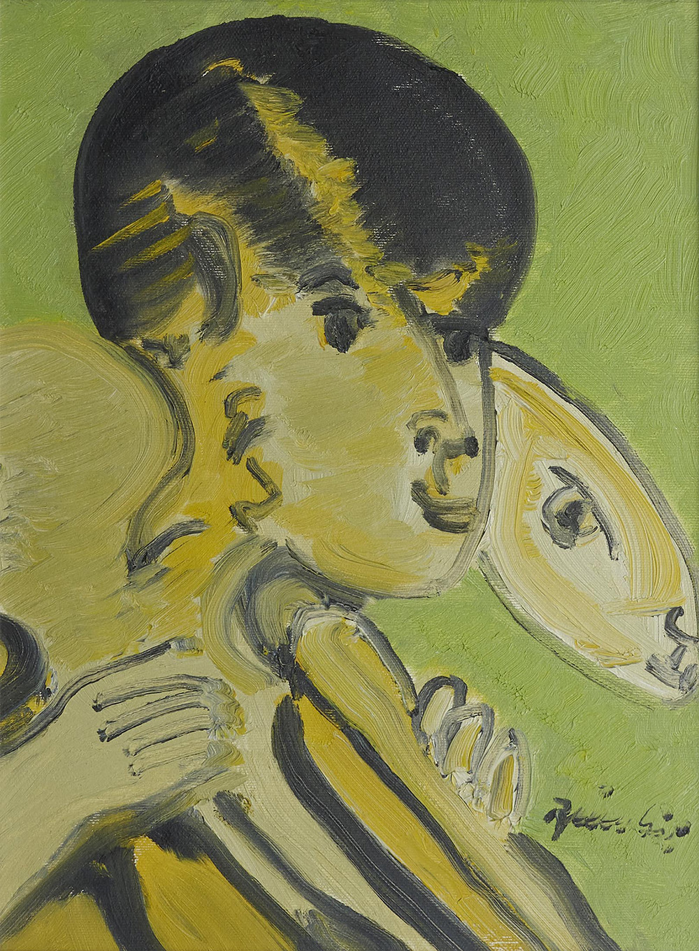 Remo Brindisi 1918 - 1996 Pastorale Acrilico su tela H40 x L30 cm (15.75 x 11.81 in. ) Firma in basso a destra Dichiarazione di autenticità sul retro Provenienza Collezione privata, Milano Certificato L'opera è accompagnata da certificato di autenticità rilasciato dall'artista. L'opera è incorniciata.