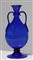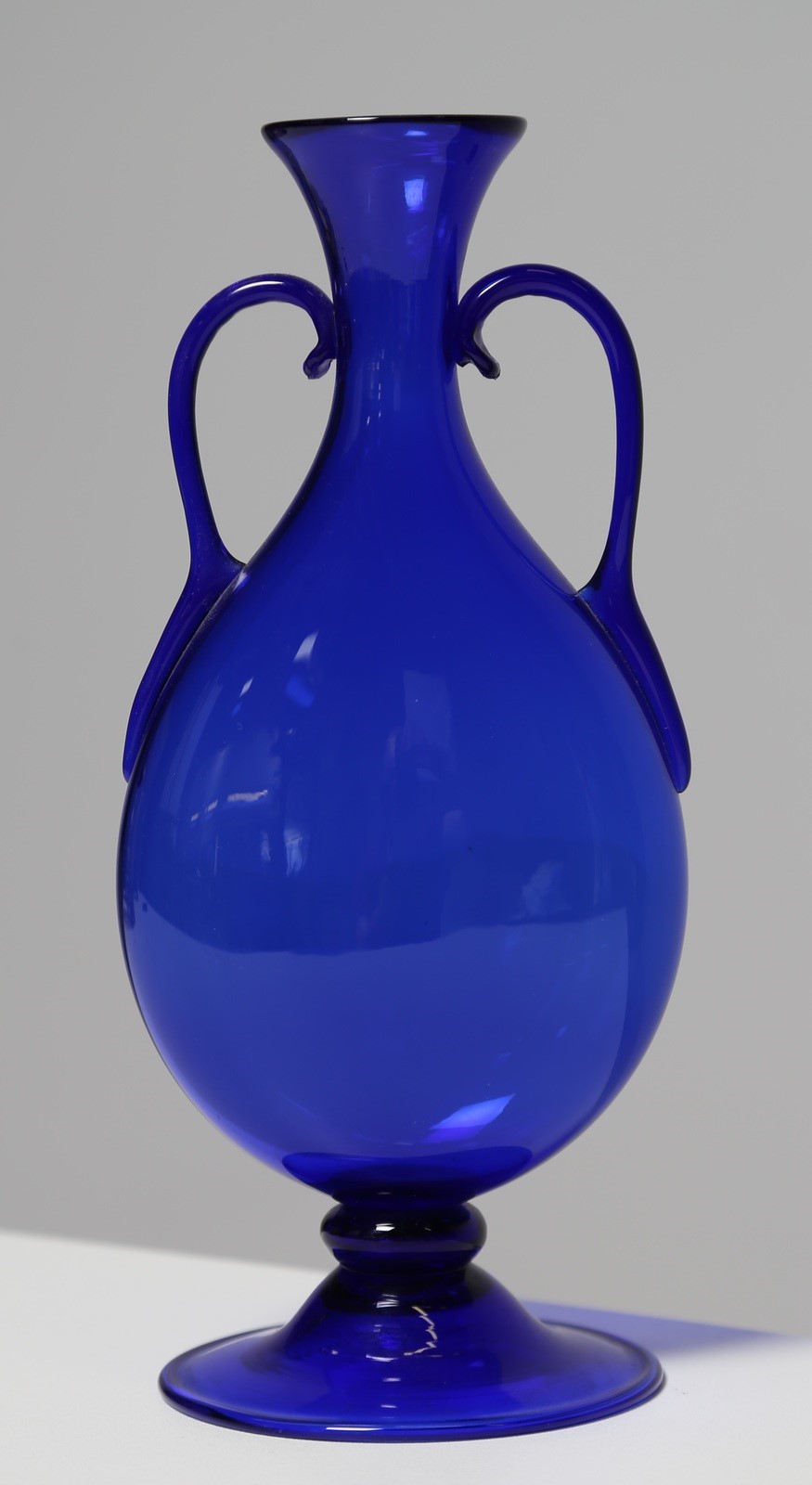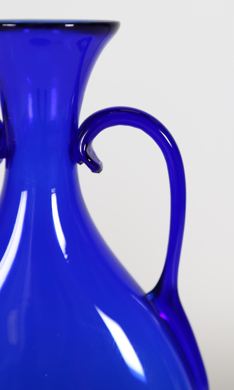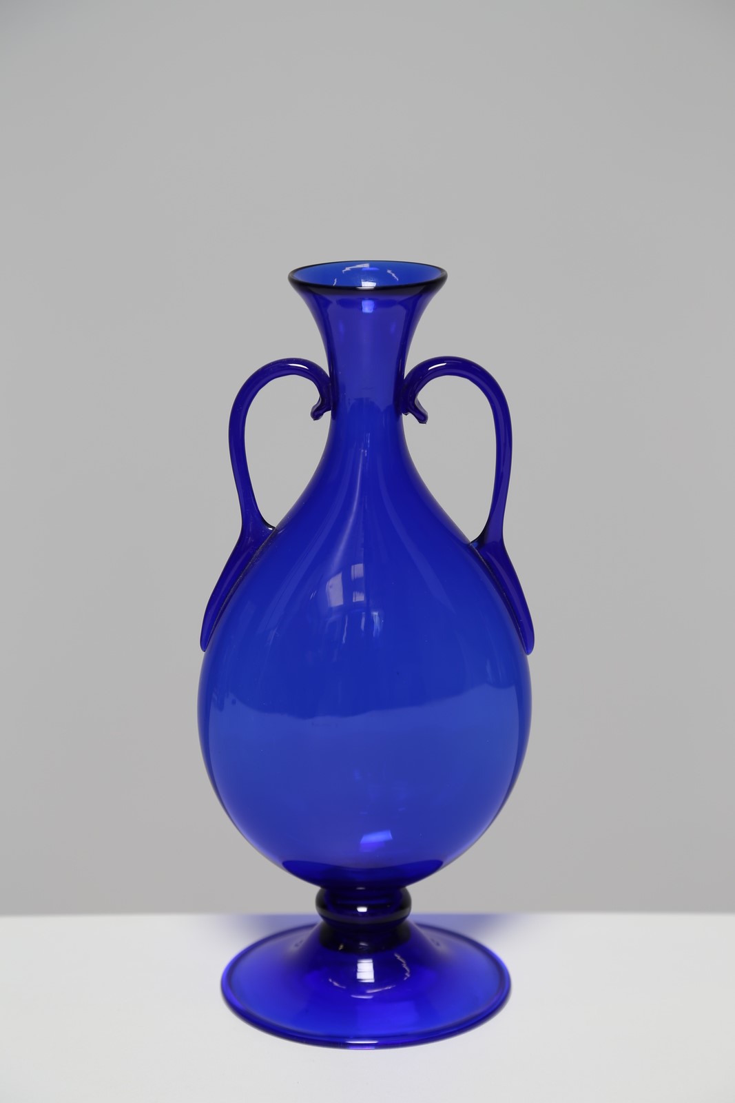 C.V.A. Vaso. Vetro di Murano. Cm 11,00 x 25,50 x 10,00. Vetro di Murano soffiato in blu colbalto e biansato, 1955. Firma alla base: "C. V. A. Murano, 1995".