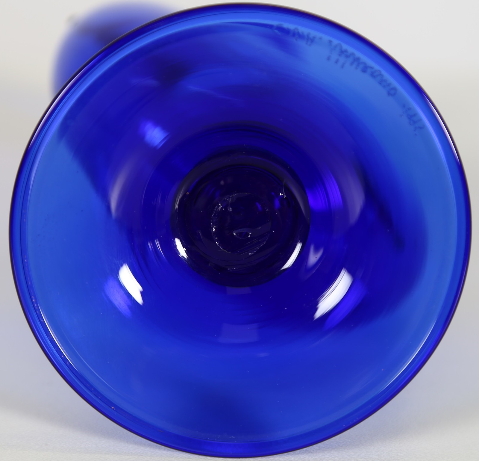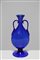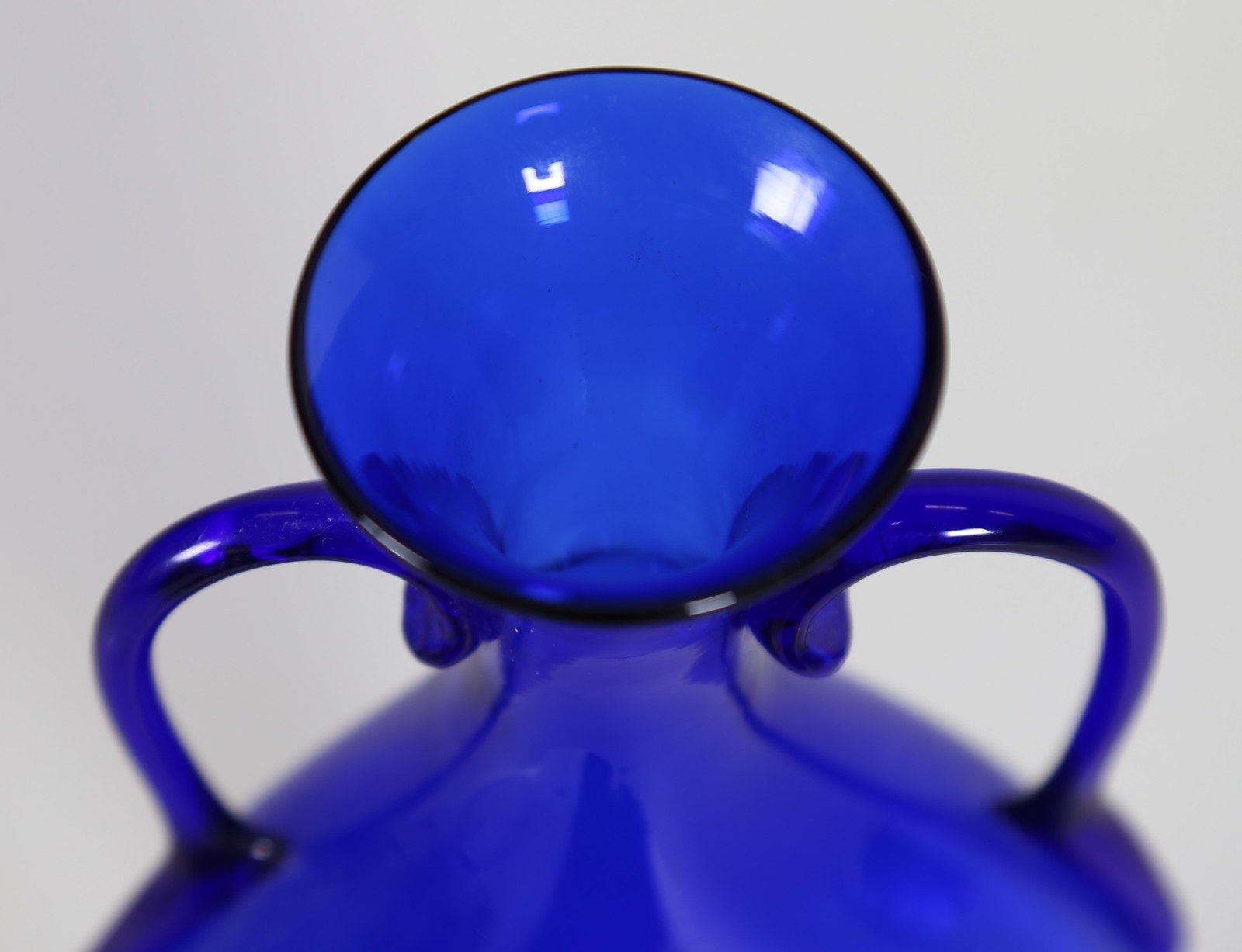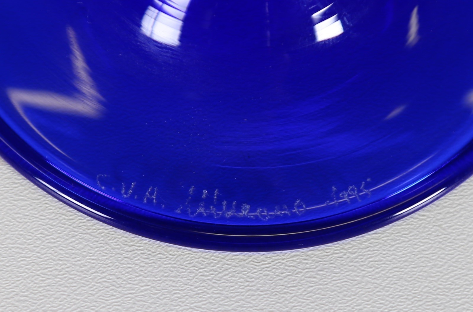 C.V.A. Vaso. Vetro di Murano. Cm 11,00 x 25,50 x 10,00. Vetro di Murano soffiato in blu colbalto e biansato, 1955. Firma alla base: "C. V. A. Murano, 1995".