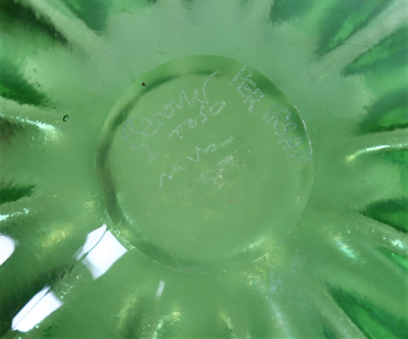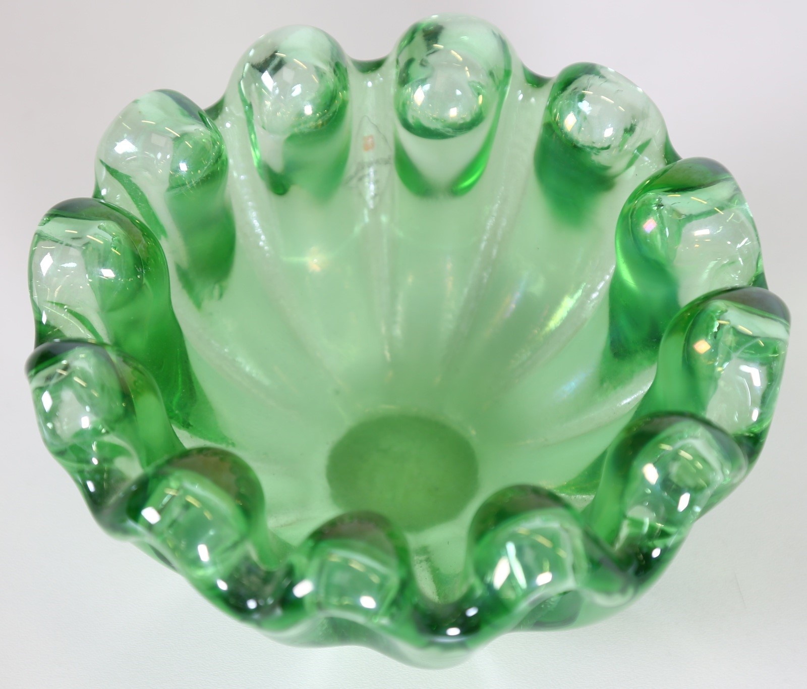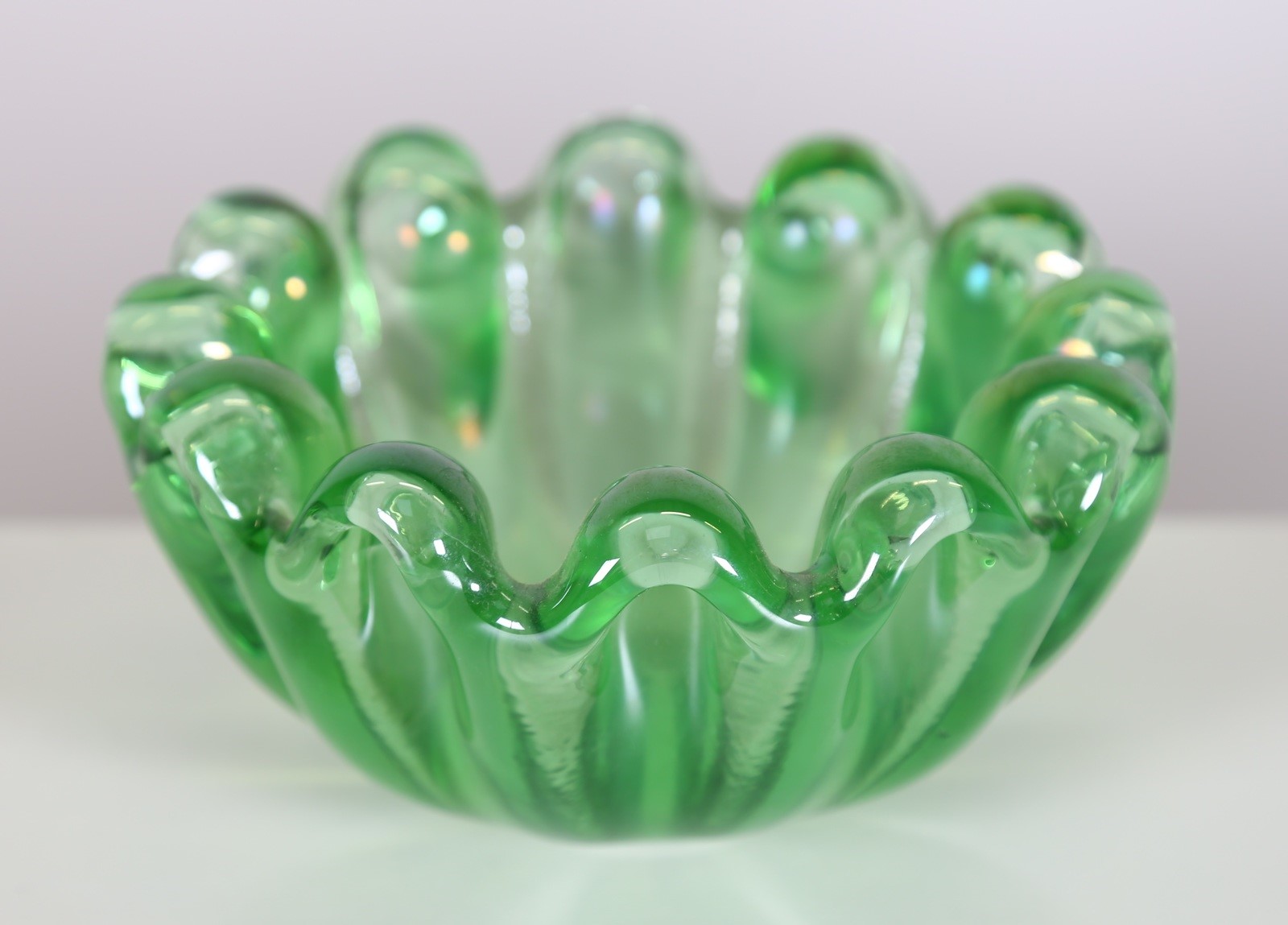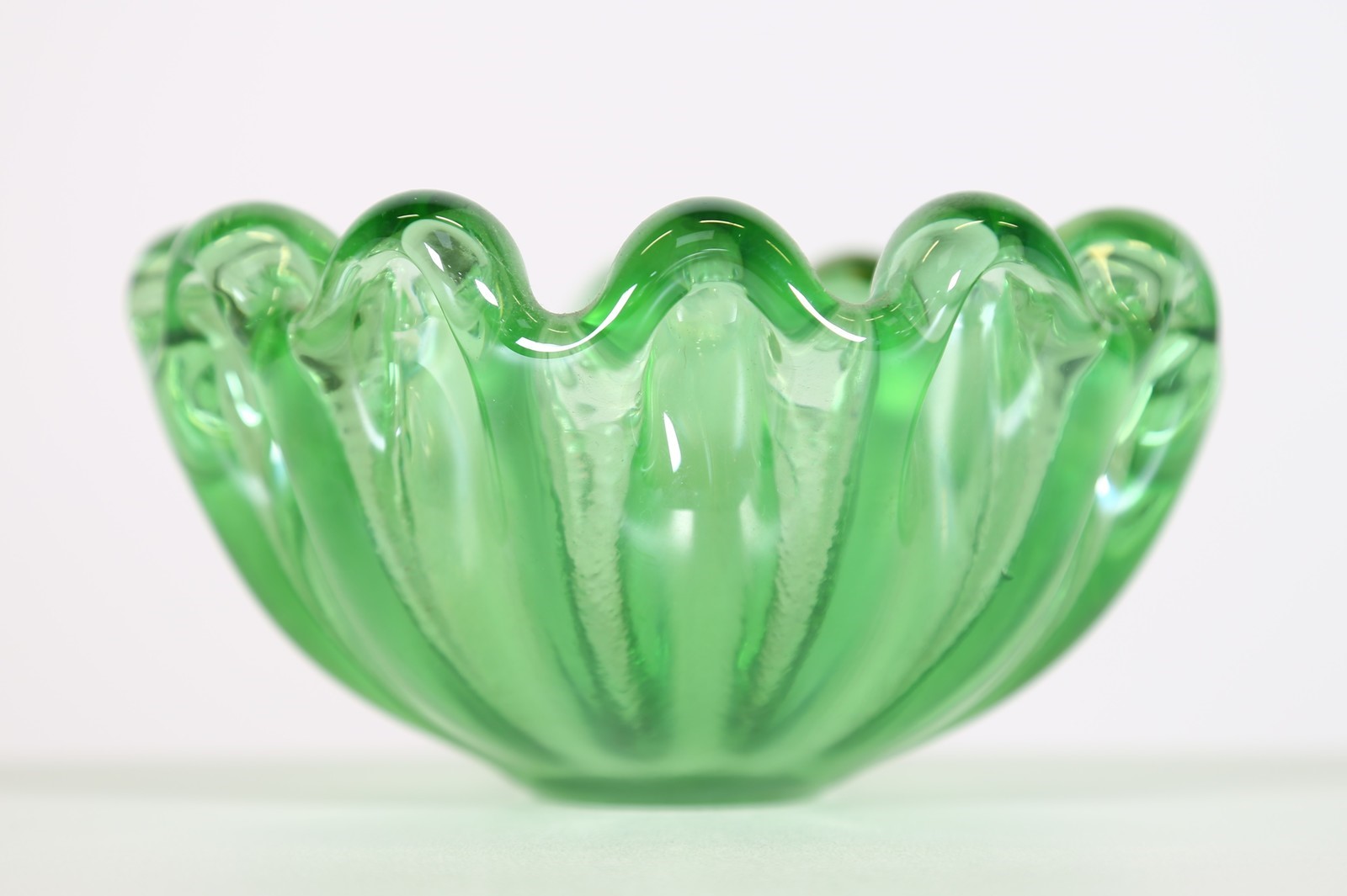 BAROVIER & TOSO Bowl. Murano glass. Cm 16,00 x 18,00 x 16,00. Ribbed green water, 70s.