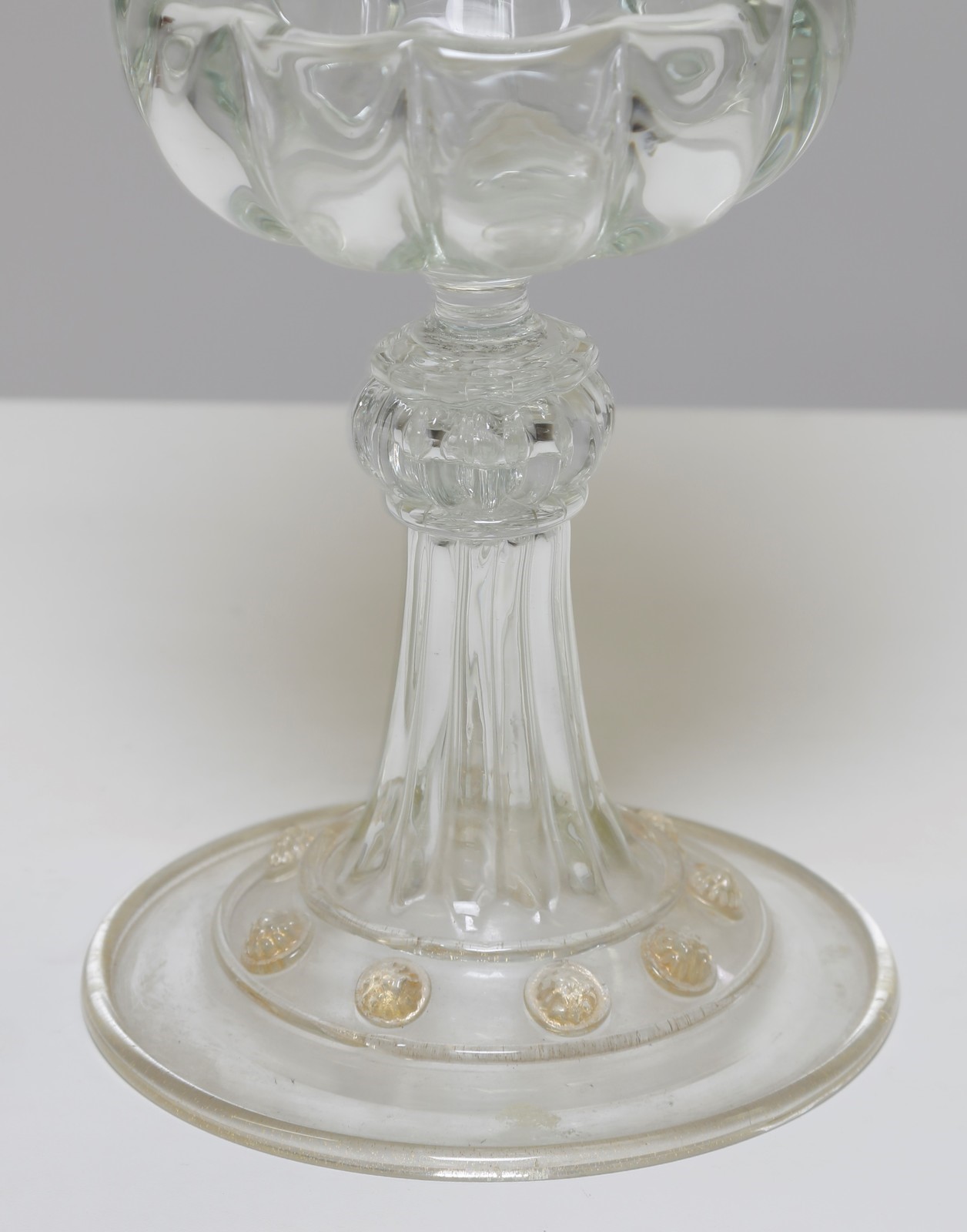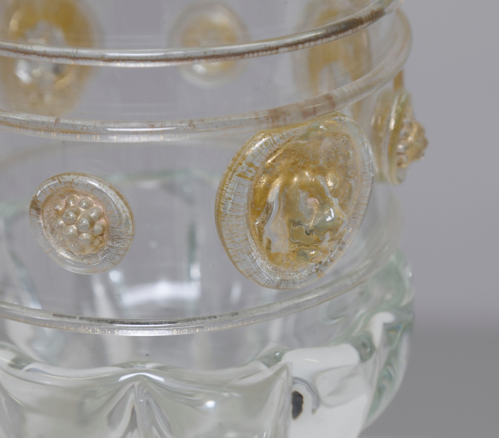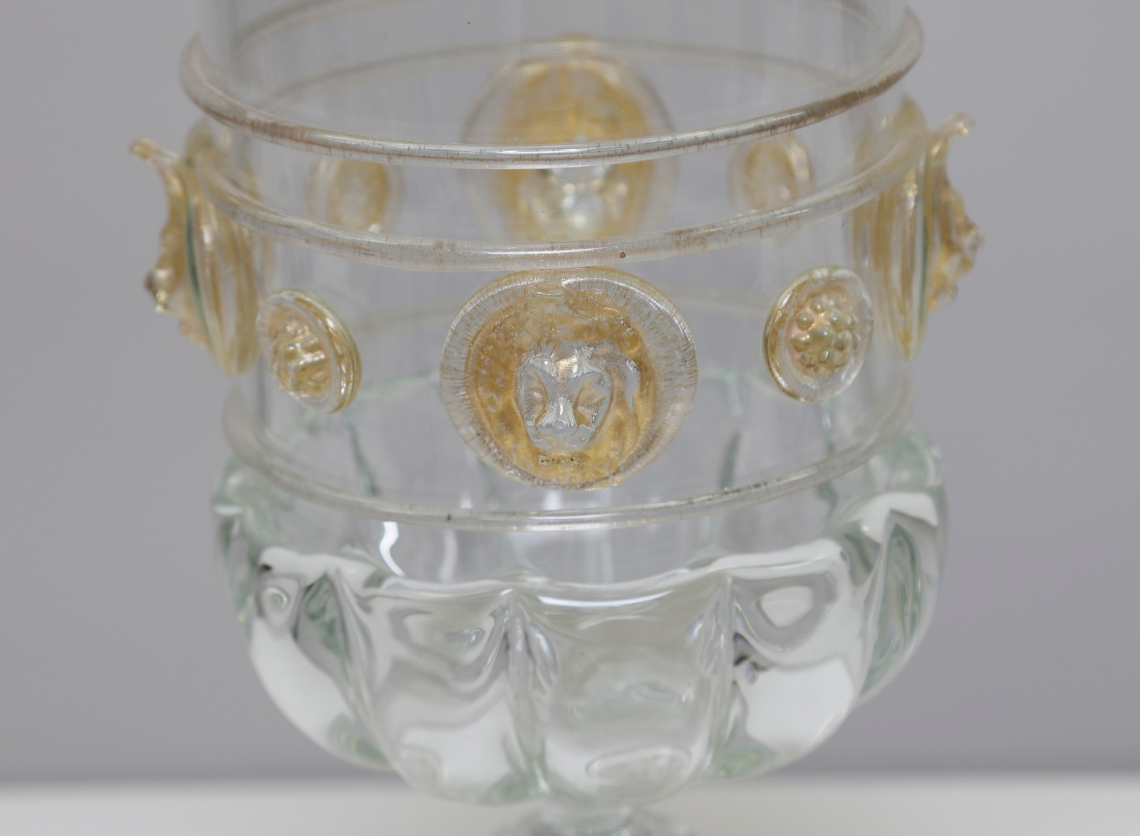 SALVIATI VETRERIA Cup. Murano glass. Cm 17,50 x 45,50 x 17,50. Large cup in transparent glass, worked in half molding and with gold leaf applications. 70's