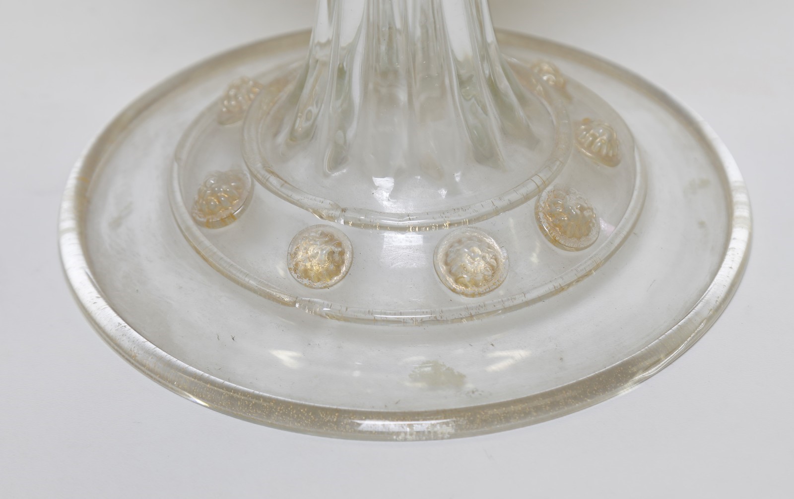 SALVIATI VETRERIA Coppa. Vetro di Murano. Cm 17,50 x 45,50 x 17,50. Grande coppa in vetro trasparente, lavorata a mezza stampatura e con applicazioni in foglia oro. Anni ‘70