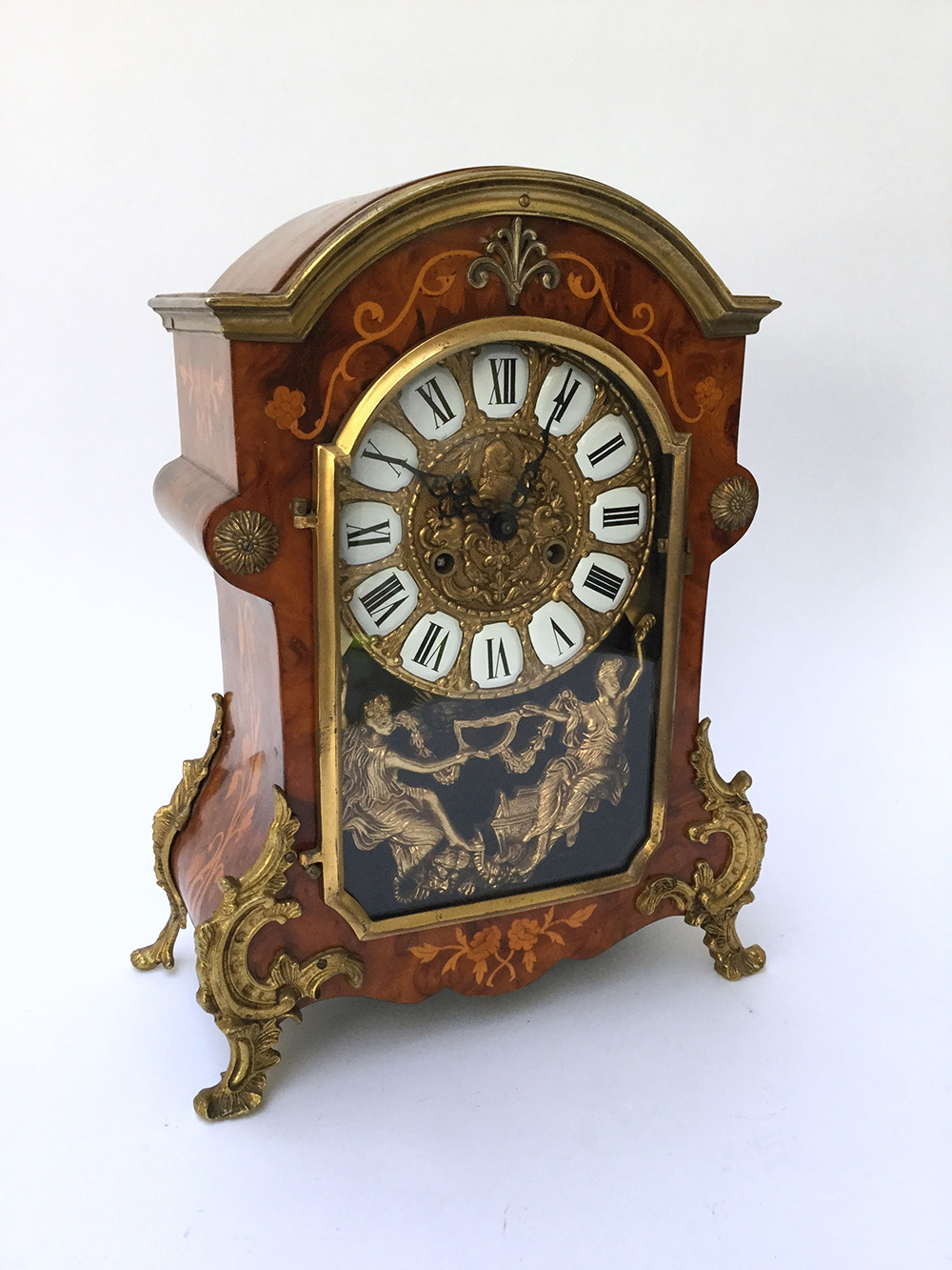 Pendola da tavolo con cassa in radica, decori a motivi floreali e guarnizioni in metallo, quadrante a cartouches con numeri romani, movimento con carica settimanale suoneria delle ore e delle mezze su campanello (cm 32 x 42 x 15) (difetti)