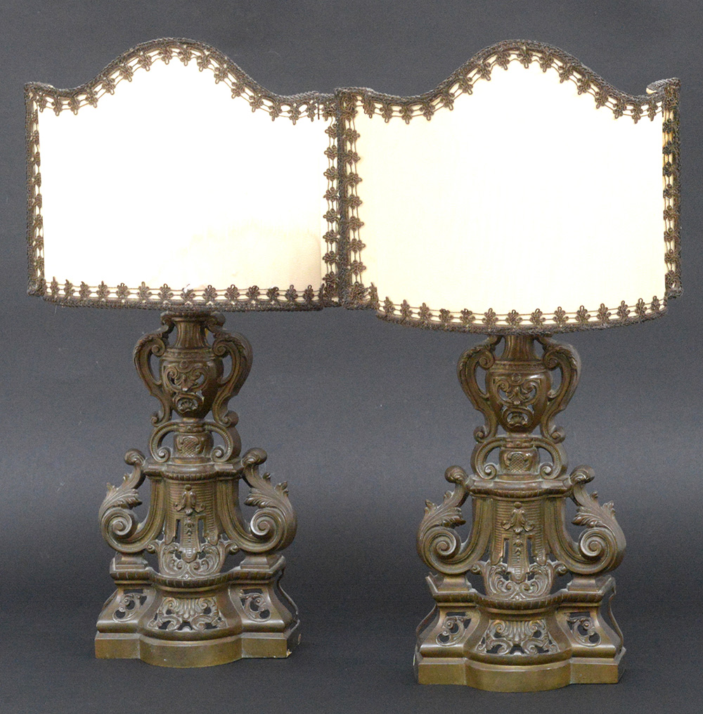 Coppia di lampade da tavolo ad una luce in bronzo traforato con decoro a volute (h struttura cm 42) (lievi difetti)