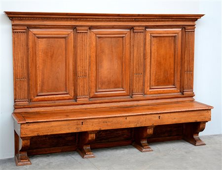 Antica panca da chiesa in noce con schienale alto a tre pannelli divisi da lesene scanalate, seduta sollevabile con scomparto (cm 102x150x42) (difetti e restauri)