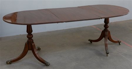 Tavolo allungabile in stile Sheraton con gambe desinenti a zampa ferina su rotelle. Inghilterra, secolo XIX (cm tot 210x74x84) (difetti e restauri)