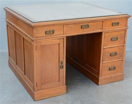 Scrivania doppia con sei cassetti e uno sportello su ambo i lati, piano con inserto in similpelle protetto da vetro. Primi decenni del secolo XX (cm 119x83x110) (difetti)