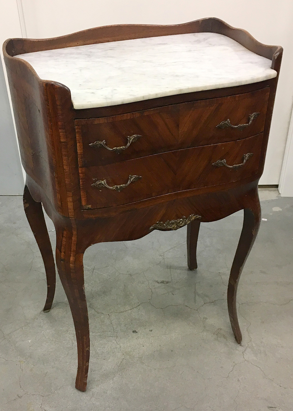 Comodino di forma mossa lastronato e filettato, due cassetti sul fronte. Applicazioni in metallo. Gambe sagomate, piano in marmo (cm 43x74x35). Francia, secolo XIX (difetti)