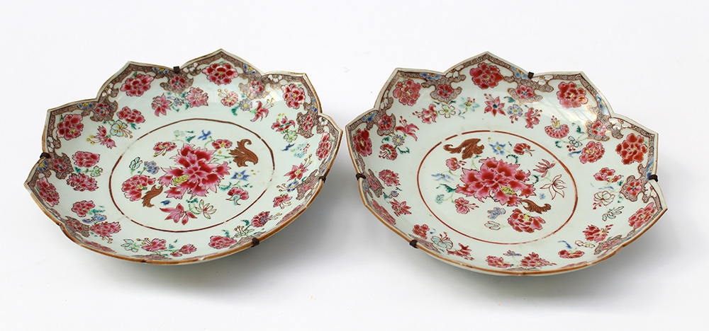 Coppia di piatti lobati in porcellana Famiglia Rosa e dorature decorati con fiori di peonia. Cina, sec. XVIII (d cm 23) (difetti)