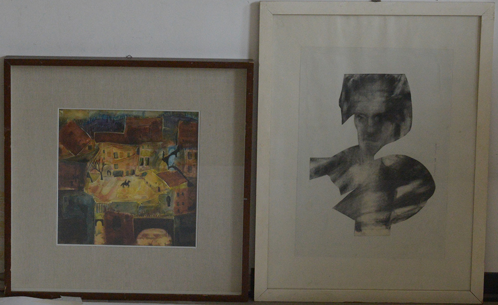 Lotto di tre dipinti e una tecnica mista di autori e misure differenti, in cornici (difetti)