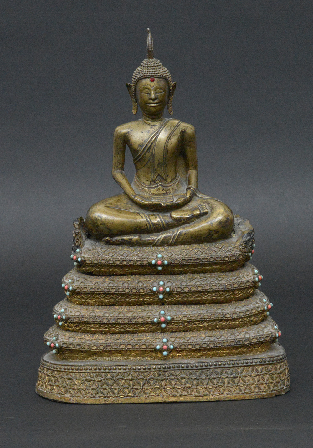 Scultura in bronzo raffigurante Buddha seduto su base a più livelli decorata con motivi geometrici e pietre dure (h cm 40) (difetti)