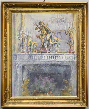 Ignoto del secolo XIX "Scorcio di interno con camino". Acquerello su carta (cm 70x47) in cornice (difetti)