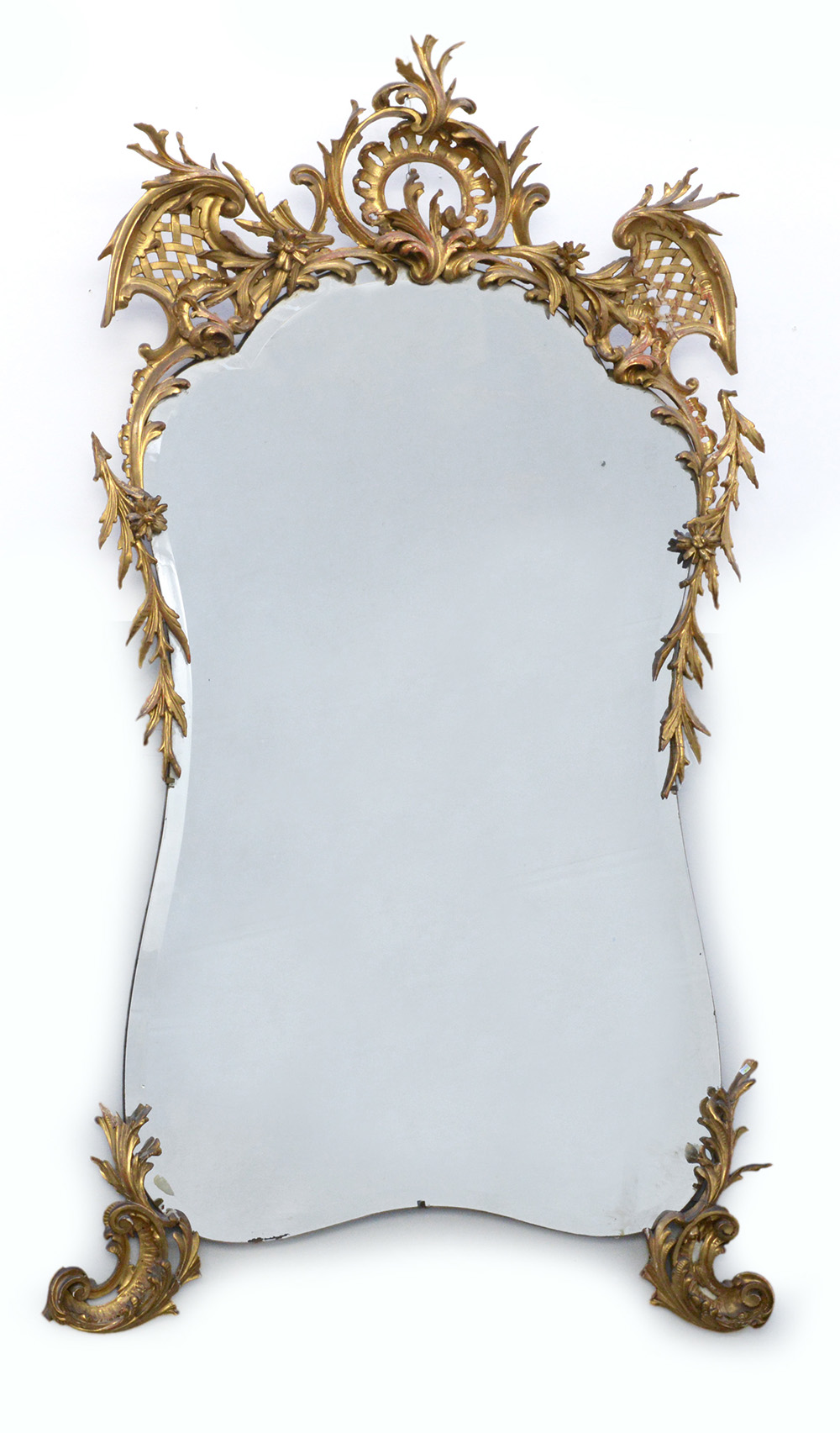Specchio di forma sagomata decorato da antichi fregi applicati in legno dorato ed intagliato a motivi vegetali e fiori (cm 200x100) (difetti, restauri e mancanze)