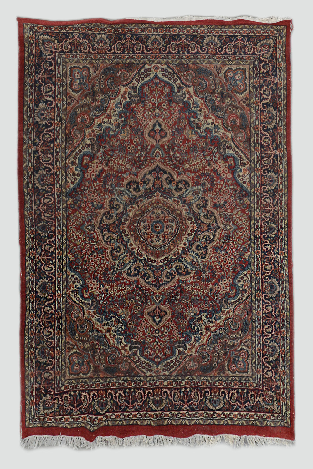 Tappeto Shrinagar, India secolo XX. Disegno a medaglione polilobato su fondo rosso (cm 277x180)