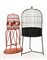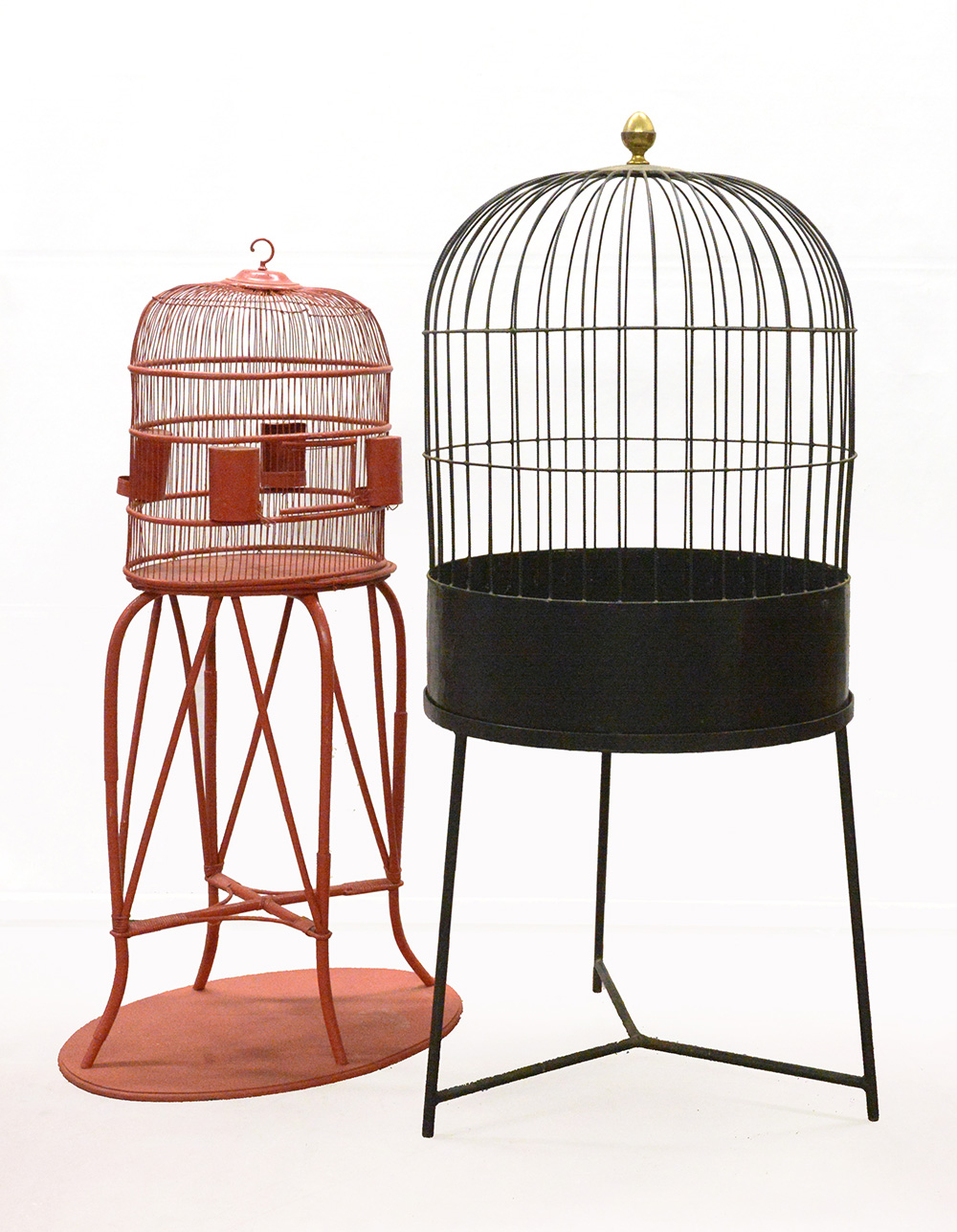 Lotto di due gabbie per uccellini in legno e ferro laccati nero e rosso (difetti)