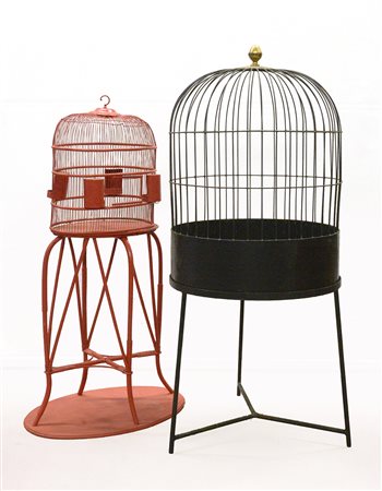 Lotto di due gabbie per uccellini in legno e ferro laccati nero e rosso...