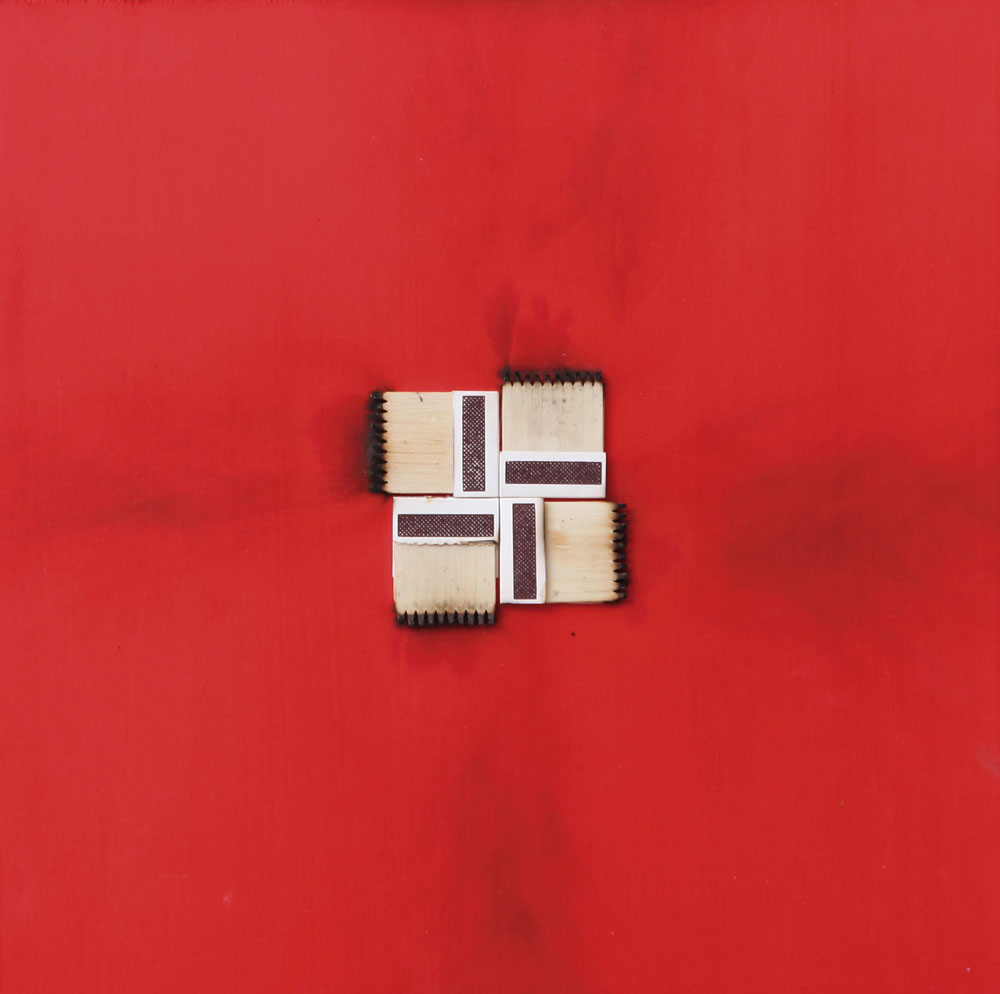 BERNARD AUBERTIN Fontenay aux Roses 1934  Dessin de feu, 2009 fiammiferi bruciati applicati su tavola rossa cm. 40x40, firma e anno al retro, dichiarazione d'autenticità dell'artista su foto, entro teca in plexiglass.