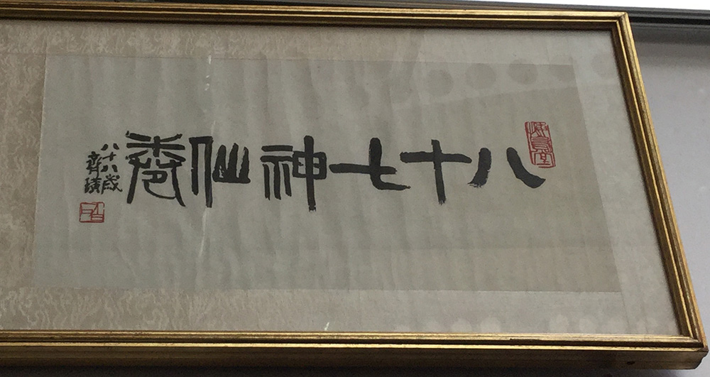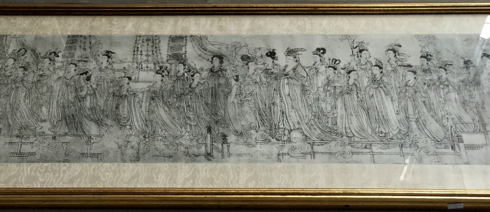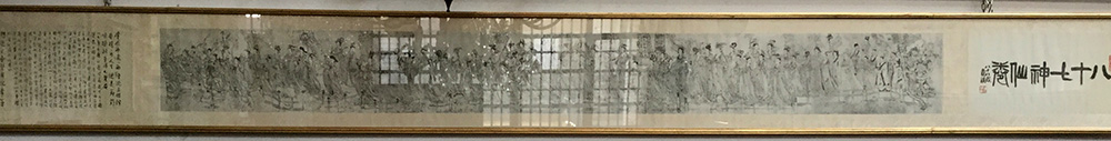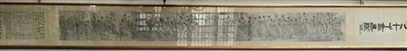 Stampa su carta con soggetto in omaggio a dipinto di epoca Tang raffigurante gli Immortali Taoisti, con commenti e calligrafia nello stile di Qi Baishi e Xu Beihong (lungh. cm 30x314) (lievi difetti) In cornice