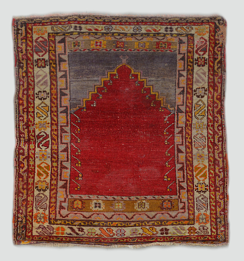 Tappeto preghiera Mudjiur, Anatolia, inizio secolo XX. Mirab a fondo rosso su camo beige (cm117x98) (difetti)