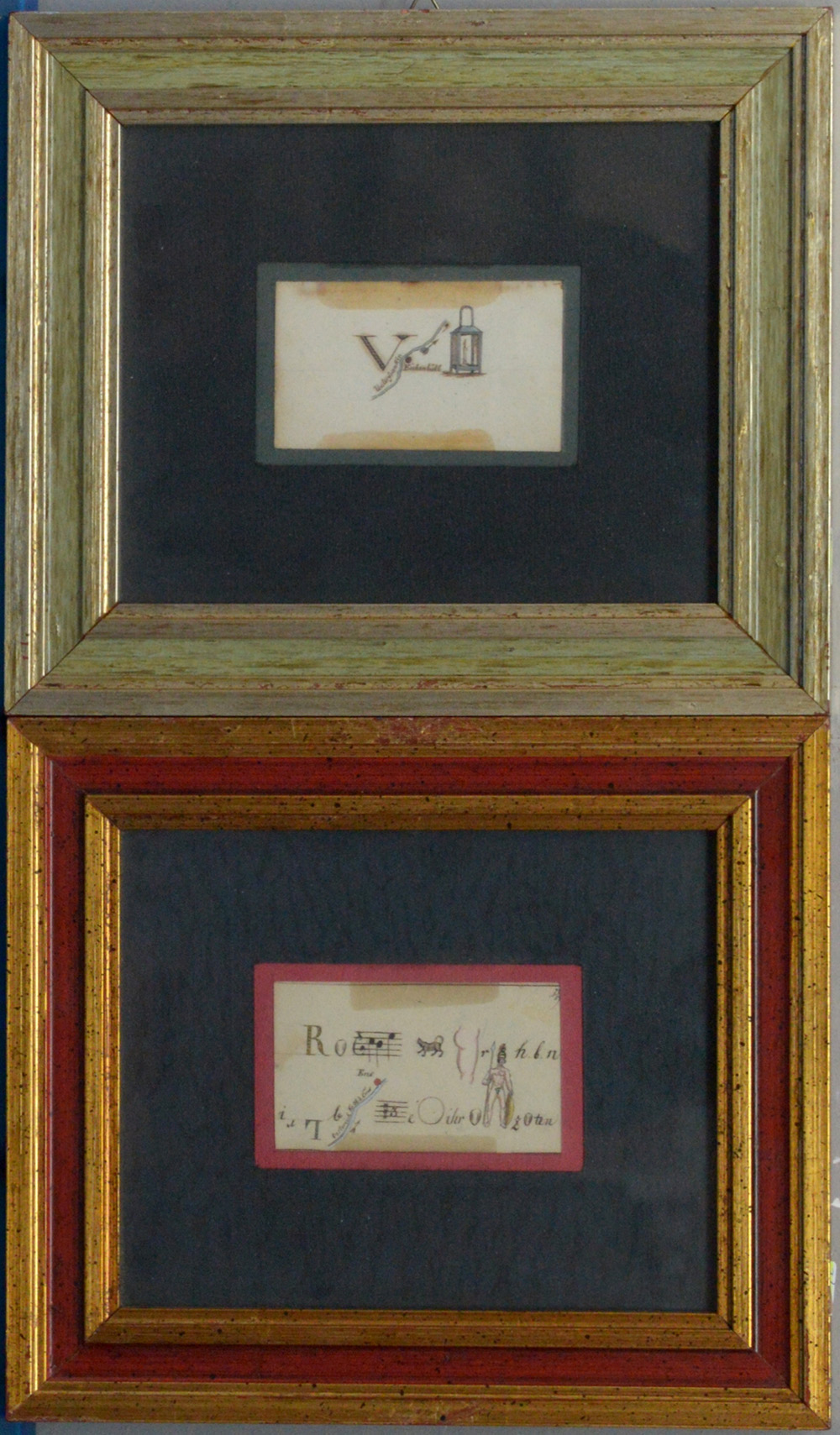 Lotto di due bozzetti "Original Rebus-Karte", tecnica mista su carta, misure diverse, secolo XIX. In cornici (difetti)