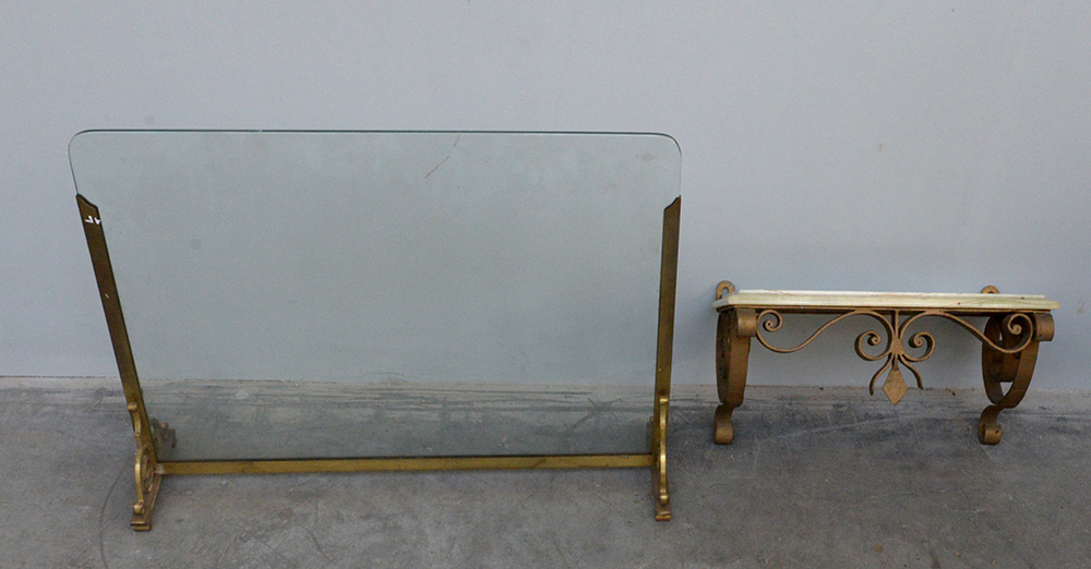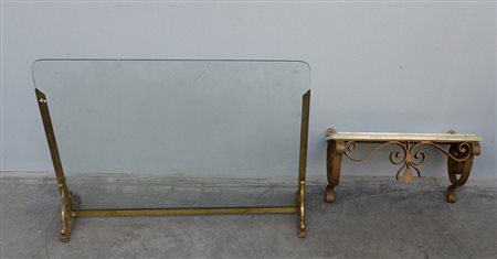 Lotto composto da un parascintille in ottone e vetro ed una mensolina in ferro battuto con pianetto in marmoDI (difetti)