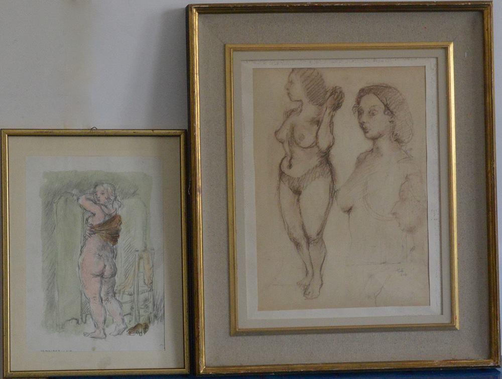 Lotto di due disegni a tecnica mista raffiguranti studi di nudi femminili, misure differenti, in cornici (difetti)