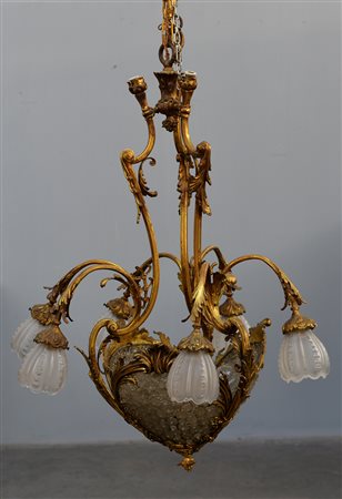 Lampadario in metallo dorato decorato a motivi vegetali, parte inferiore decorata a perlinature e fiori in vetro, sei braccia sagomate con paralumi in vetro (h cm 100) (difetti e mancanze)
