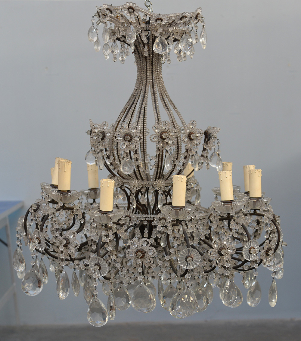 Lampadario a tredici luci in metallo brunito a finto bronzo interamente rivestito da parlinature, gocce in vetro (h cm 100) (difetti e mancanze)