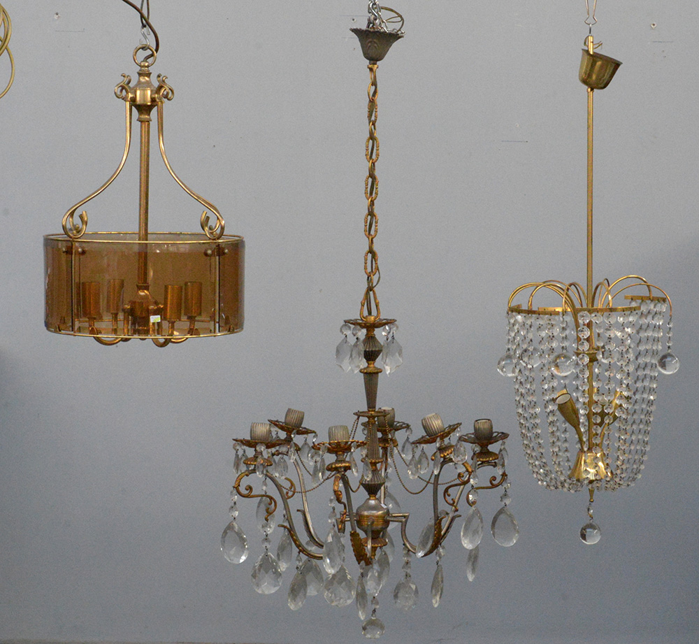 Lotto composto da tre lampadarietti diversi in ottone, metallo, vetro e vetro fumè (difetti e mancanze)