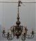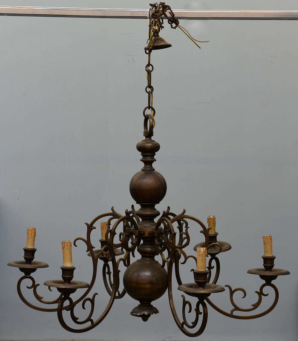 Lampadario a sei luci in stile olandese in metallo brunito a finto bronzo, braccia sagomate (h cm 80) (difetti)