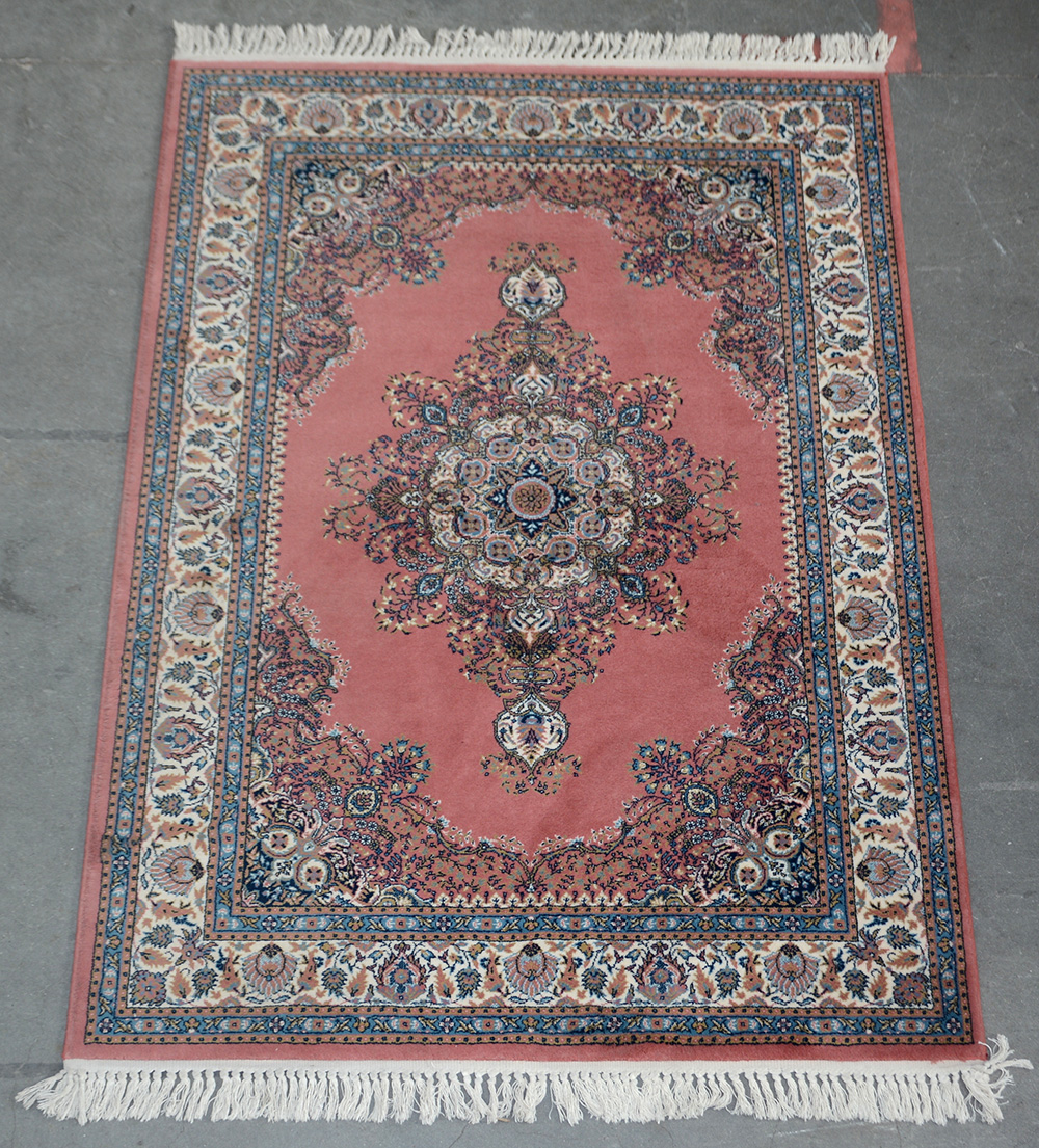 Tappeto meccanico di moderna manifattura . Decoro con medaglione floreale su fondo rosa (cm 199x141) lievi difetti
