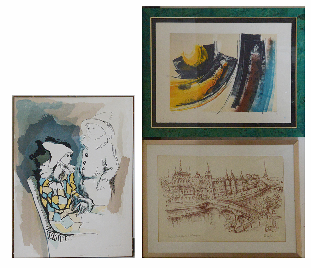 Lotto di tre litografie di soggetto, autori e misure differenti, in cornici (difetti)