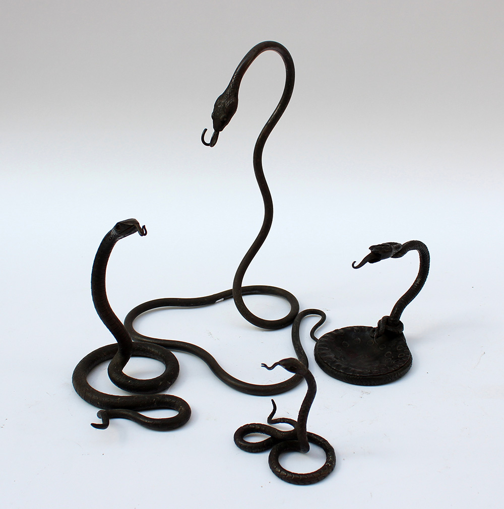 Lotto di quattro supporti per orologi in bronzo a forma di serpenti, misure diverse
