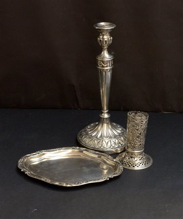 Lotto di argenti composto da un candeliere "Impero" con fusto a colonna scanalata a base tonda cesellata a palmette, un vassoietto con bordo sagomato ed un contenitore traforato e cesellato (difetti)