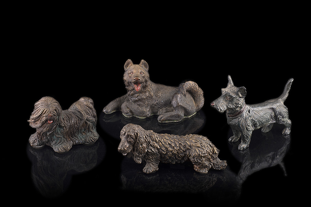 Manifatture diverse. Gruppo di quattro sculture in bronzo e metallo raffiguranti cani, alcuni smaltate (difetti)
