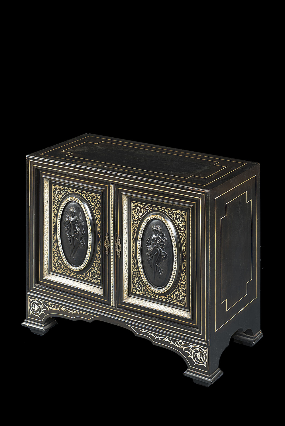 Stipo in legno ebanizzato e filettato a due ante centrate da medaglioni decorati da allegorie dell'Estate e della Primavera, entro intarsi in avorio a volute e motivi fogliati. Scarabattolo a cassettiera con prese tornite in avorio. Bottega di Ferdinando Pogliani, fine secolo XIX (cm 50x45x27) (lievi restauri)