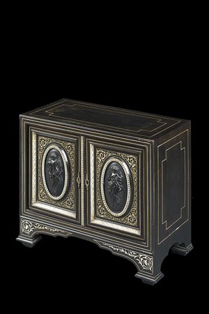 Stipo in legno ebanizzato e filettato a due ante centrate da medaglioni...