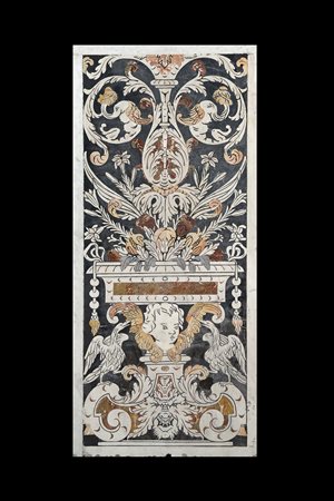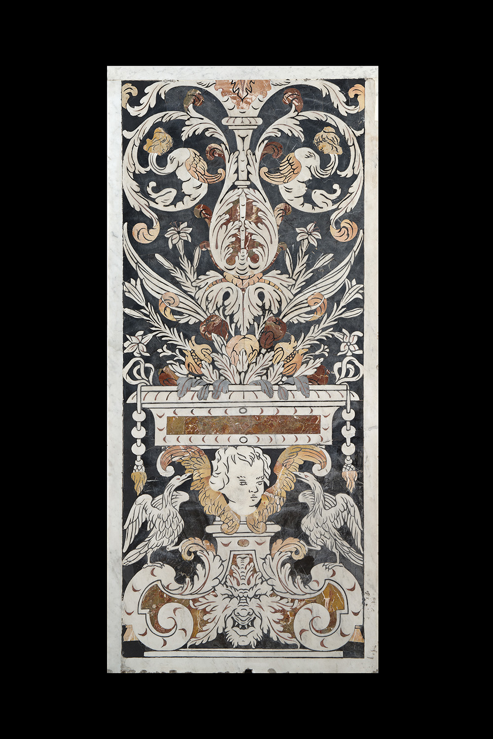Antico montante in marmo intarsiato a volute, volatili e cherubino sormontato da elemento architettonico con frutta (cm 70x156x5) (difetti)