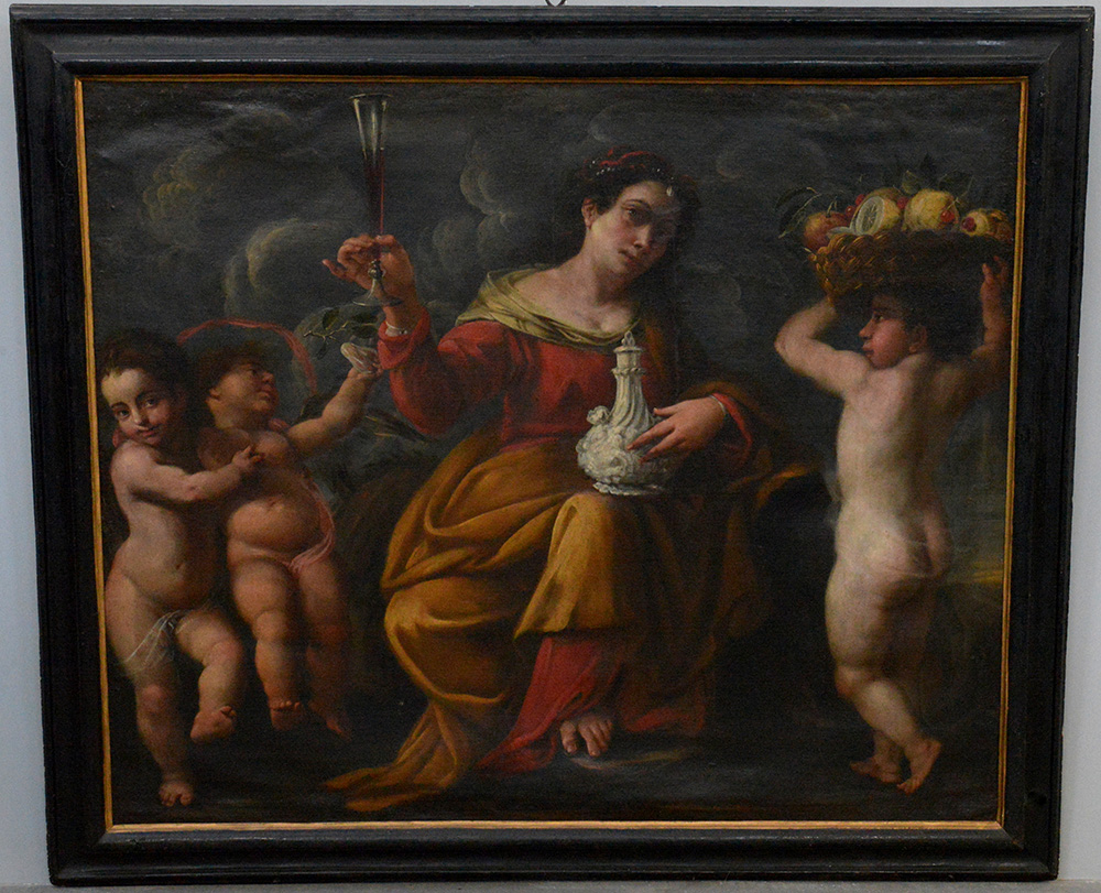 Scuola del secolo XVIII "Scena allegorica con tre putti" olio su tela. In cornice coeva in legno ebanizzato e dorato (cm 125x150) (difetti e restauri)