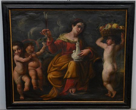 Scuola del secolo XVIII "Scena allegorica con tre putti" olio su tela. In...