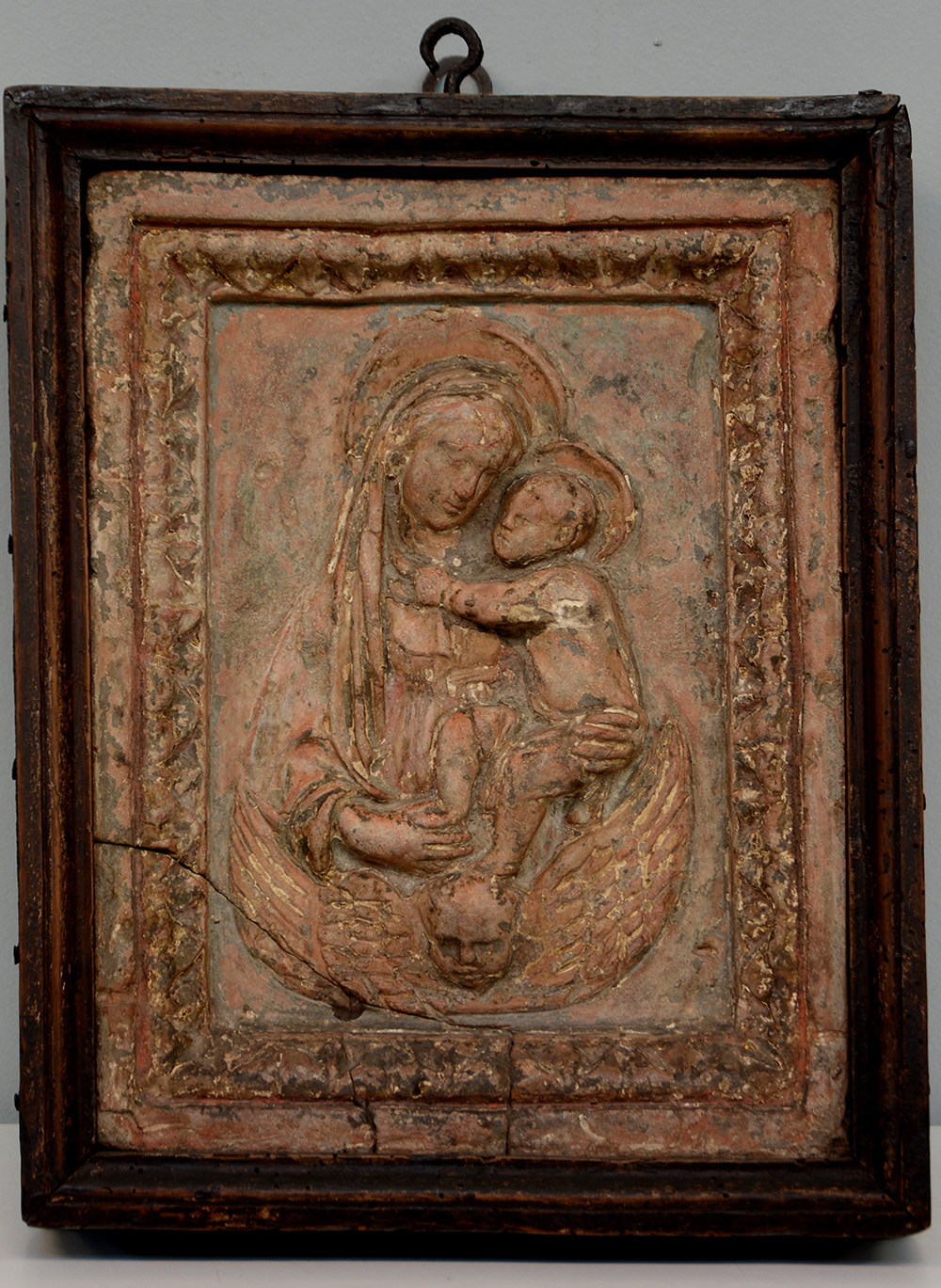 Antica formella in terracotta raffigurante la "Madonna con bambino" bassorilievo in cornice (cm tot 36x45) (difetti)