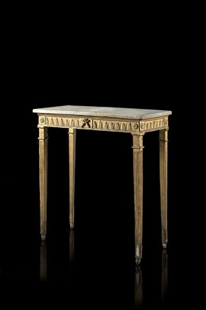 Consolle in legno dorato con fascia intagliata a palmette e Amorini. Gambe scanalate decorate all'attacco da rosoni. Piano in marmo bianco. Secolo XVIII (cm 90x84x42) (difetti)