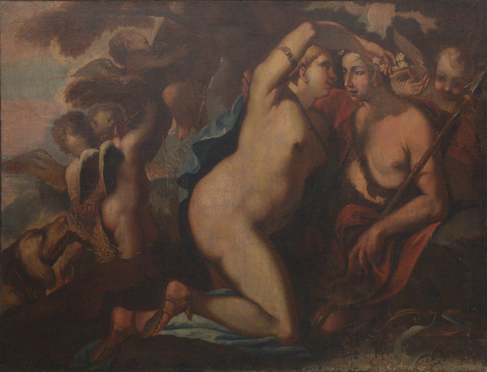 Scuola veneta del secolo XVIII "Diana e Callisto" olio su tela (cm 138,5x180) (gravi difetti e restauri)